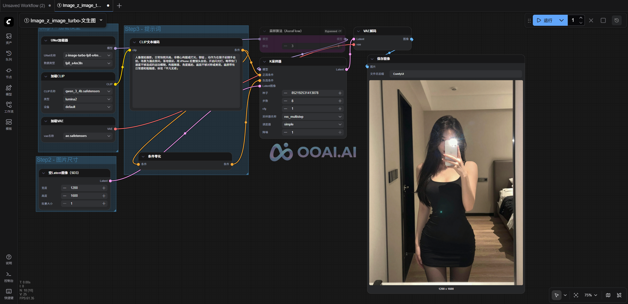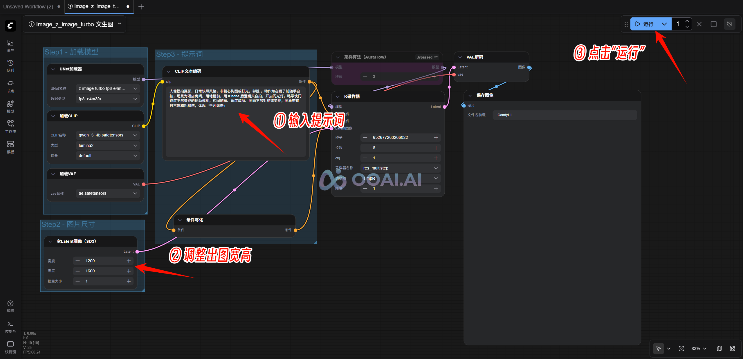 ④ 输入提示词,调整出图宽高,最后点击“运行”即可