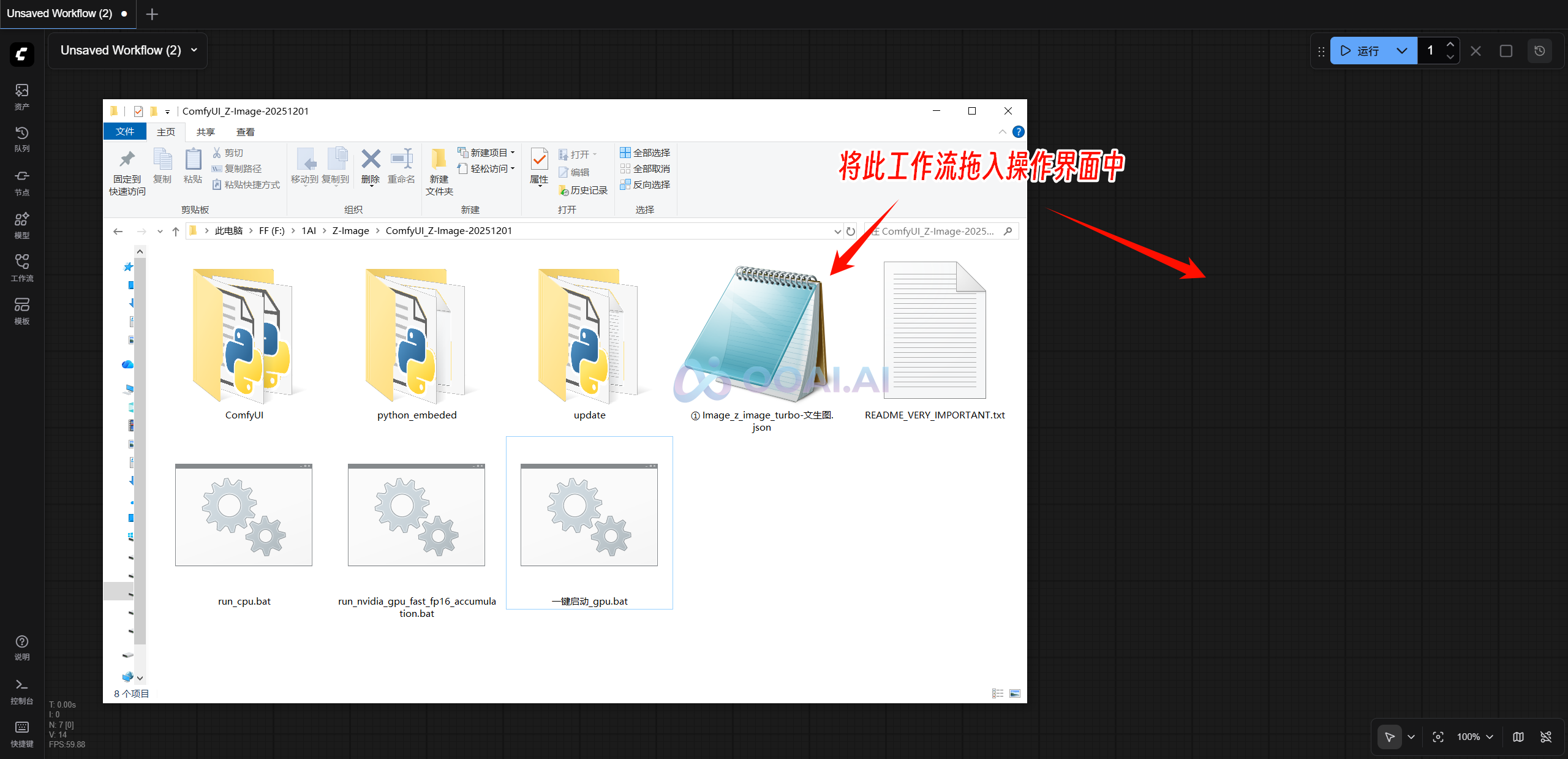 ③ 将文件包中的“① Image_z_image_turbo-文生图.json”工作流文件拖到操作界面中